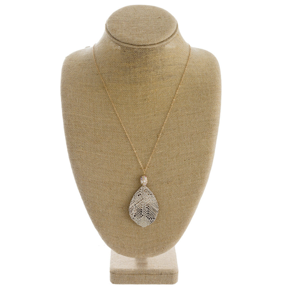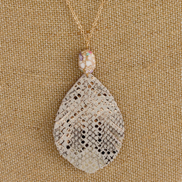 Dainty cable chain necklace featuring a faux leather feather inspired pendant with metallic snakeskin details and a natural stone accent. Pendant approximately 3". Approximately 34" in length overall.