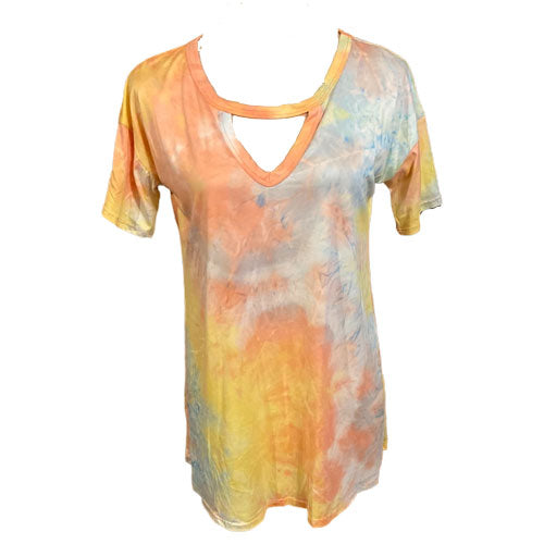 SHORT SLEEVE KEYHOLE NECK TIE DYE PRINT TOP