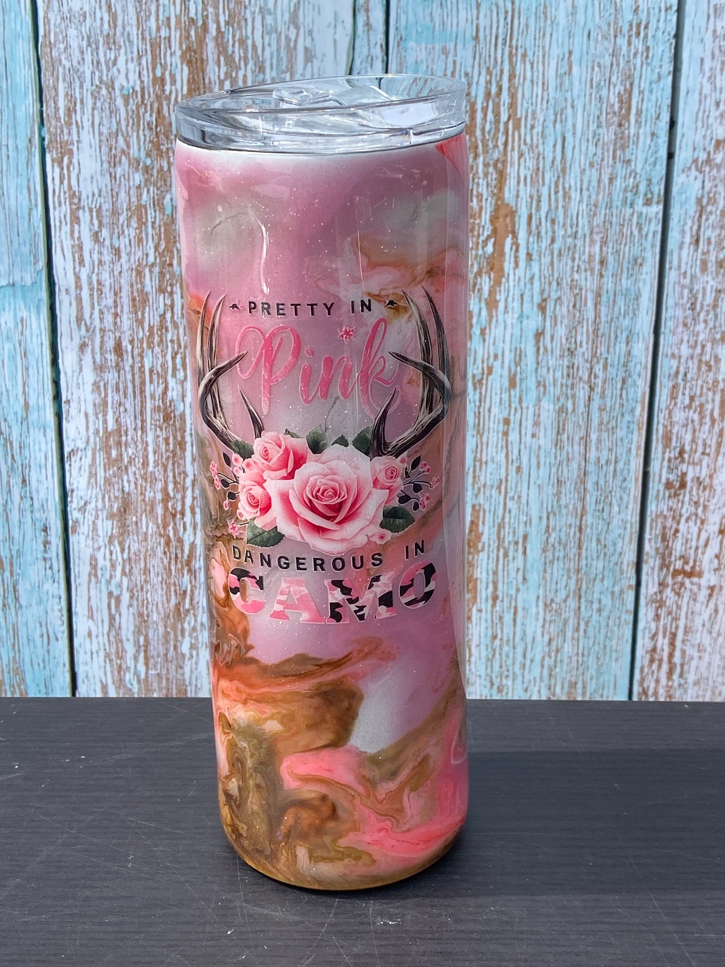 Custom Painted Pink Rose Horns Stainless Skinny Tumbler w/Sliding Lid and Straw- 20 Oz.