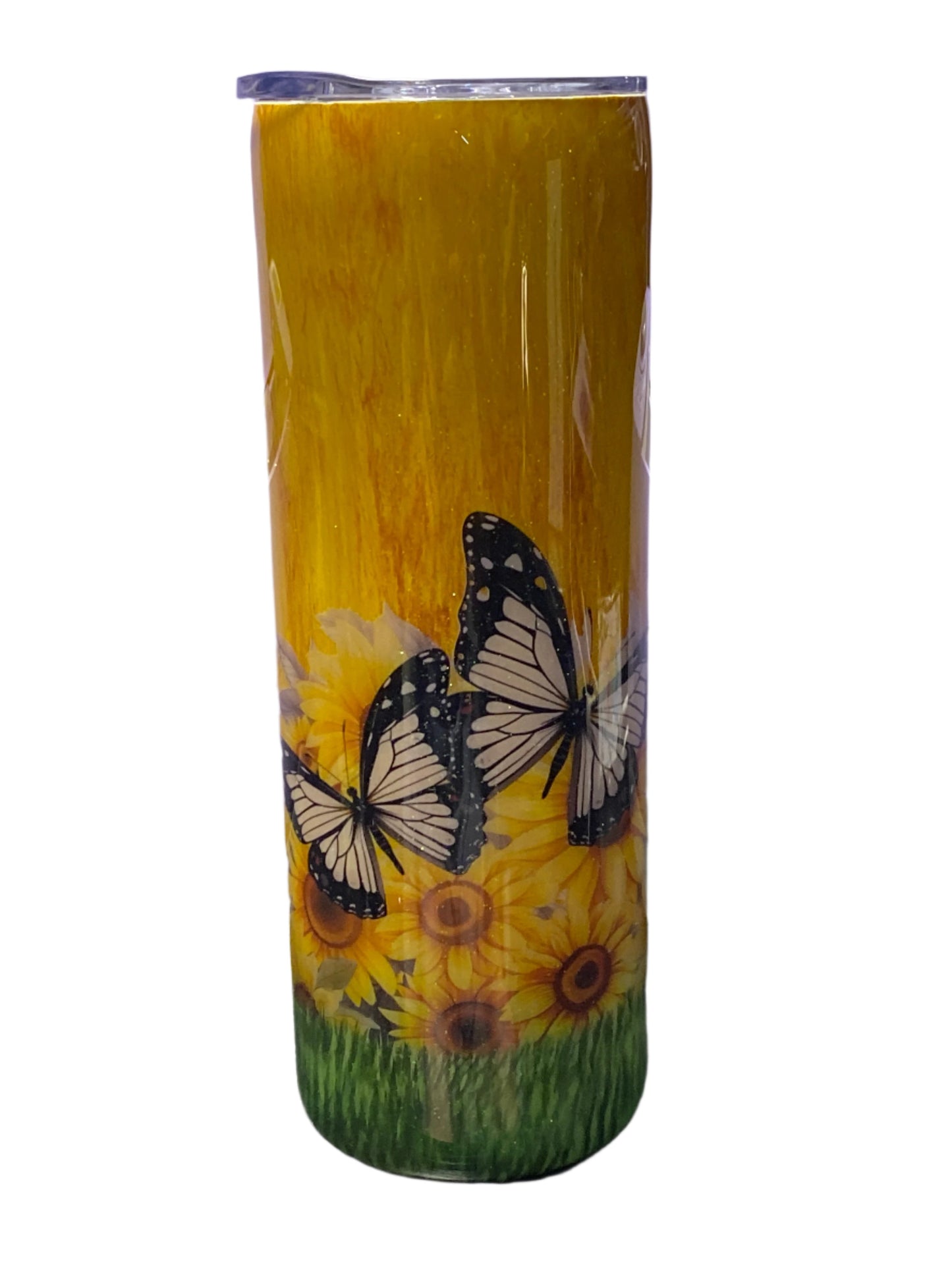 Custom Painted Yellow Butterfly Stainless Skinny Tumbler w/Sliding Lid and Straw- 20 Oz