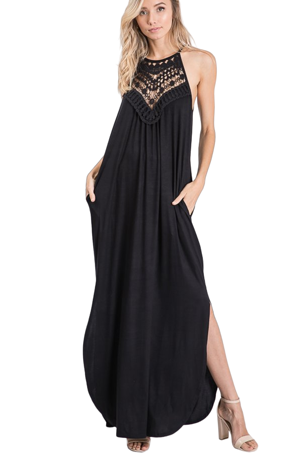 - - SLEEVELESS HALTER NECK SOLID MAXI DRESS WITH SIDE POCKET AND LACE DETAIL