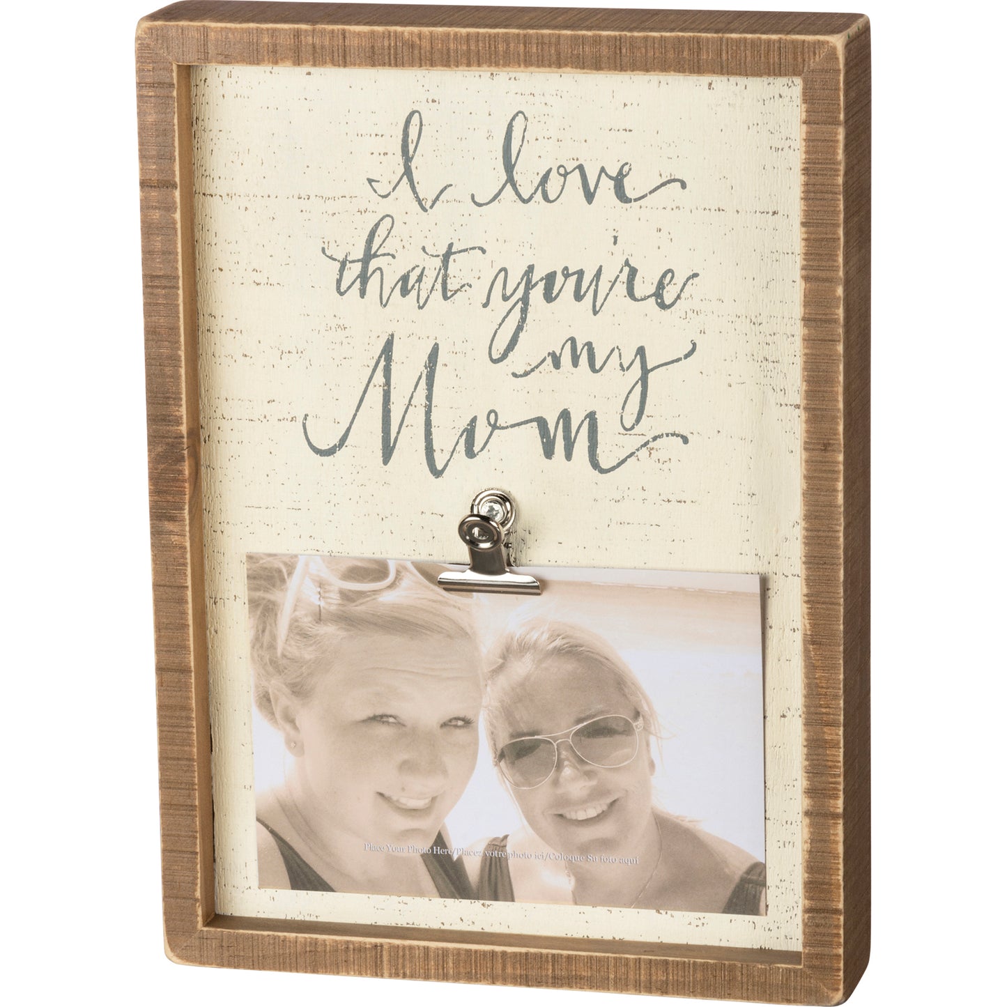 A wooden photo frame lending an inset "I Love That You're My Mom" hand lettered sentiment with metal clip for displaying a photo. Complements well with coordinating design pieces for a thoughtful gift set. Easy to hang or can free-stand alone.
