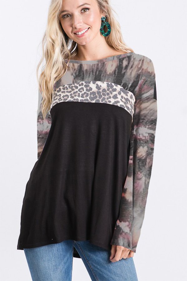 LONG SLEEVE ROUND NECK TIE DYE AND LEOPARD PRINT AND SOLID CONTRAST TOP