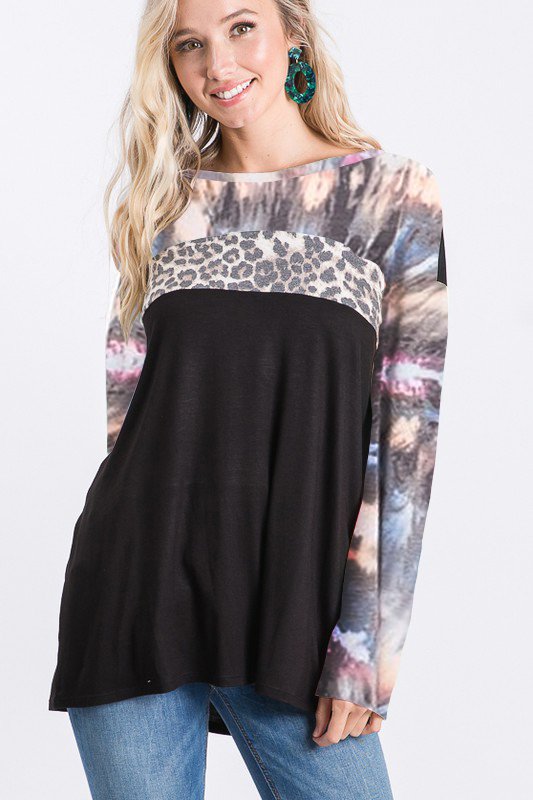 - - LONG SLEEVE ROUND NECK TIE DYE AND LEOPARD PRINT AND SOLID CONTRAST TOP