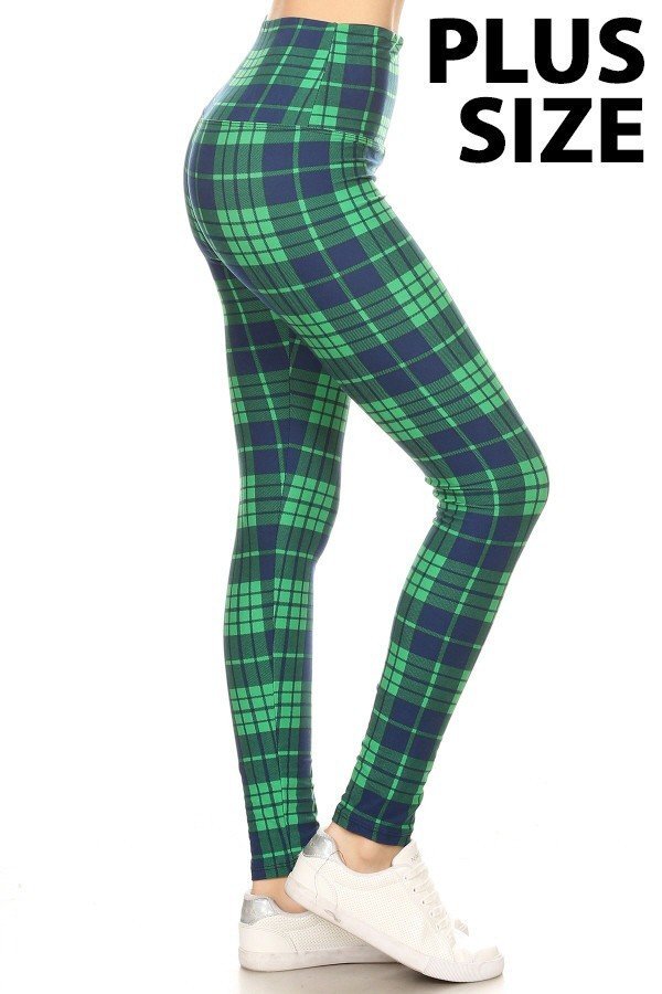 PLUS SIZE 5IN YOGA BAND BLUE/GREEN PLAID Printed Leggings