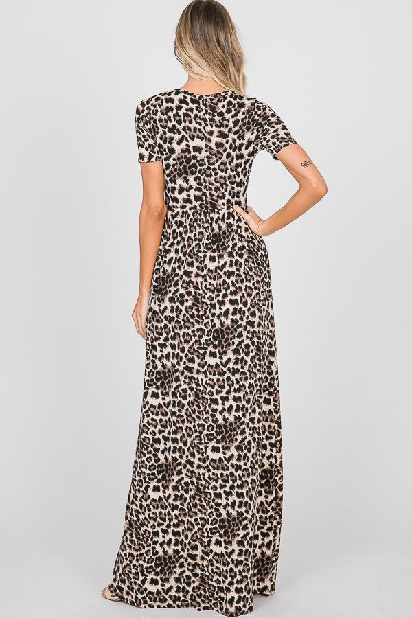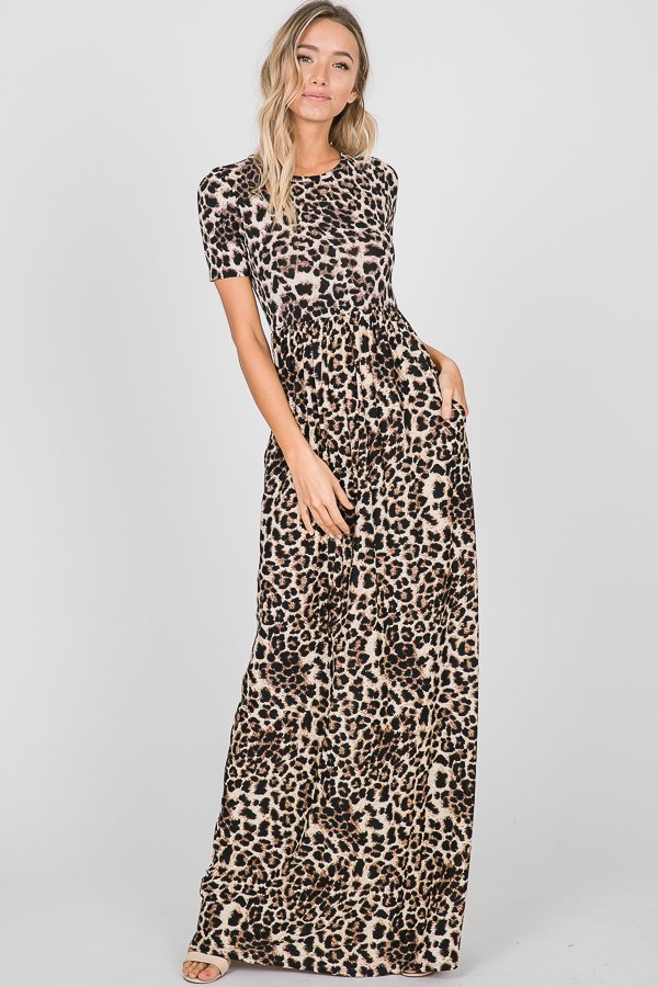 SHORT SLEEVE ANIMAL PRINT MAXI DRESS WITH SIDE POCKET