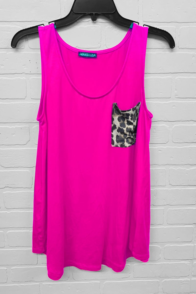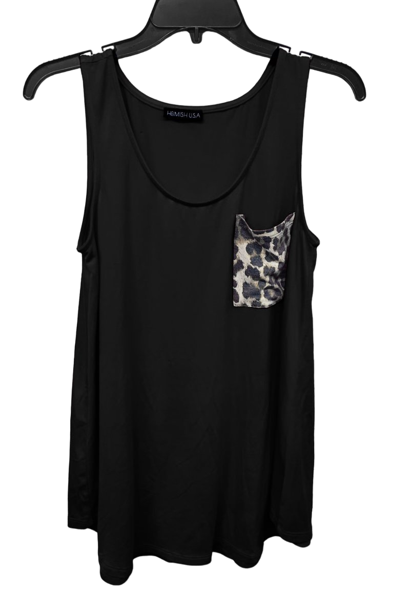 SLEEVELESS ROUND NECK SOLID TOP WITH LEOPARD PRINT POCKET DETAIL