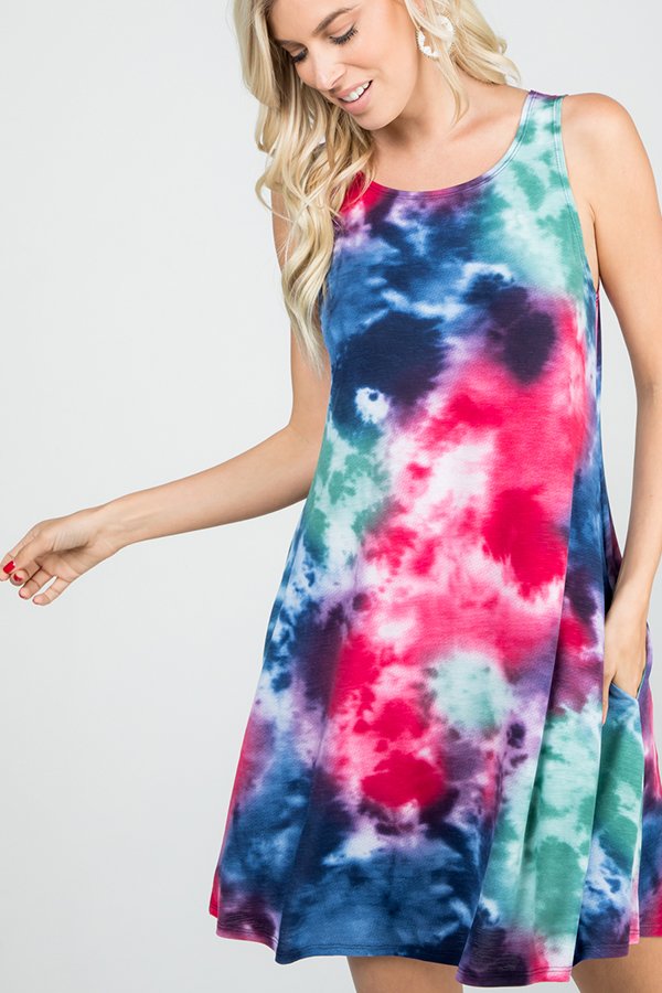 - - SLEEVELESS ROUND NECK TIE DYE PRINT DRESS WITH SIDE POCKET