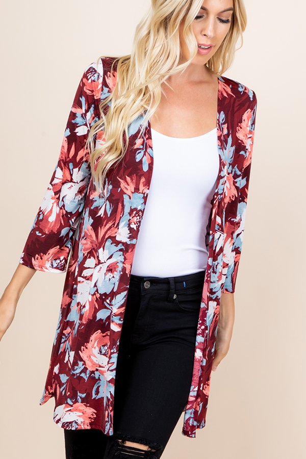 THREE QUARTER SLEEVE FLORAL PRINT CARDIGAN WITH SIDE SLIT