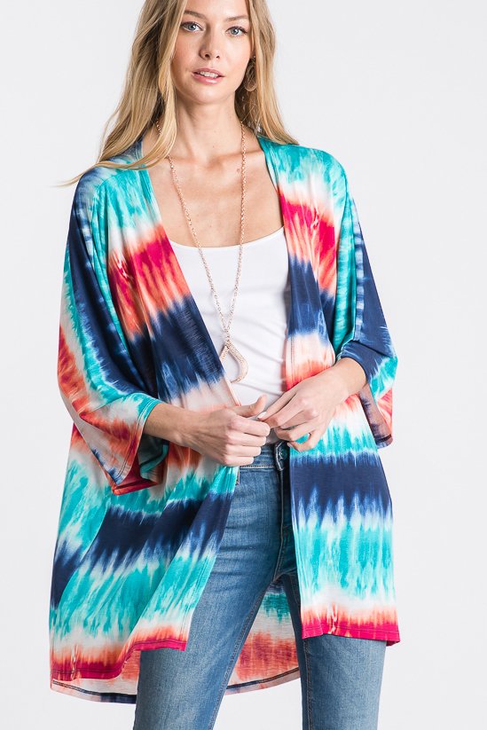 THREE QUARTER SLEEVE MULTICOLOR TIE DYE PRINT KIMONO OPEN CARDIGAN